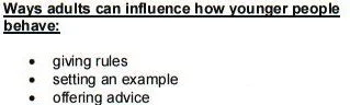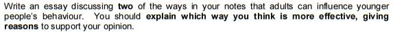 Another important point is to say which is more effective. I'd probably write one paragraph about 'giving rules', and the next paragraph would be about 'setting an example' - I would be sure to give reasons why it was a more effective way to influence younger people.